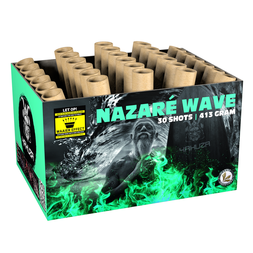 Wunderschöner Fächer-Cake mit 30 Schuss in maximalem Kaliber. Dadurch ist die gesamte Breite des Abendhimmels vollständig mit einem Mix an Effekten gefüllt. Spaßfakt: Erinnert an die größte Welle der Welt in Portugal.